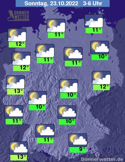 In der folgenden Nacht ist der Himmel teils stark, häufig aber auch nur locker bis aufgelockert bewölkt, dazu bleibt es trocken. Die Temperatur sinkt auf 13 Grad am Oberrhein und bis 9 Grad im Berchtesgadener Land.
