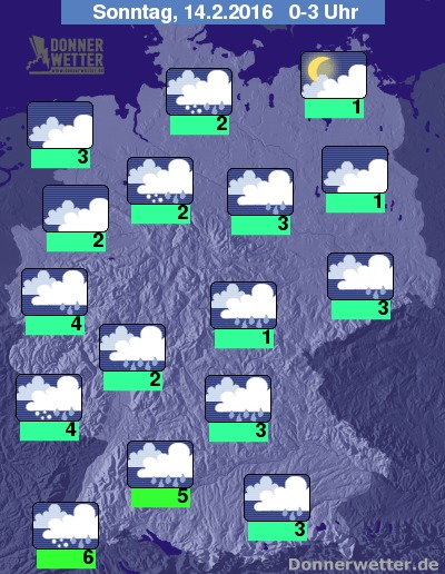 Im weiteren Nachtverlauf auf den Sonntag fällt in weiten Teilen des Landes immer wieder Schneeregen oder Regen. Vereinzelte trockene Abschnitte sind nach wie vor meist nur im äußersten Nordosten zu erwarten.