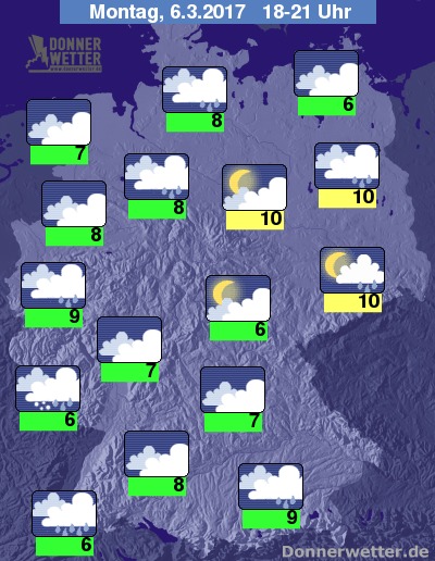 Heute Abend bleibt es überwiegend bei der starken Bewölkung, dabei fällt vor allem im Alpenvorland und im Norden zeitweise Regen, sonst fällt nur hier und da auch Regen. Auflockerungen bleiben eher selten. Die Abendwerte liegen bei 6 bis 10 Grad.