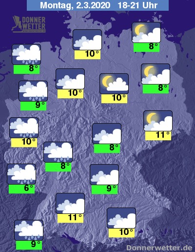 In den Abendstunden zeigt sich der Himmel verbreitet stark bewölkt oder bedeckt, nur in der Osthälfte überwiegt zunächst noch aufgelockerte Bewölkung. Im Westen muss in den kommenden Stunden immer wieder mit Schauern gerechnet werden, die später in höheren Lagen auch in Schneeregen oder Schnee übergehen können. In den übrigen Landesteilen bleibt es überwiegend trocken.