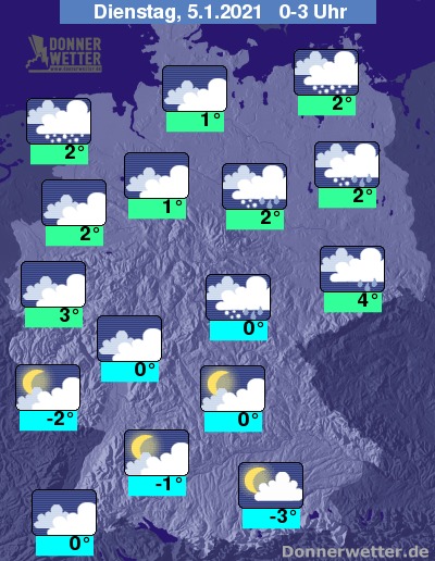In der Nacht auf Dienstag fällt vor allem im Norden und Nordosten zeitweise Schnee oder Schneeregen, örtlich besteht Glättegefahr. Im Westen bleibt es bei starker, im Süden auch zunächst noch teils aufgelockerter Bewölkung meist trocken.