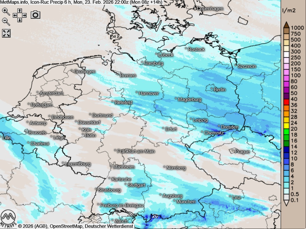 Die Wetter- / Temperaturkarte für Montagnachmittag (15:00 Uhr) sowie die 6-Stunden-Regenmengen bis 22:00 Uhr nach ICON-RUC: