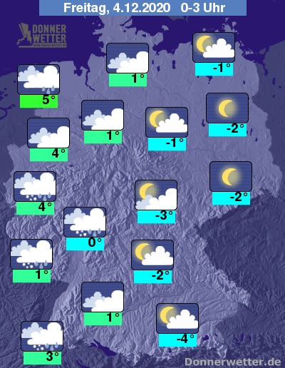 Während der zweiten Nachthälfte fällt vor allem westlich des Rheins zeitweise Regen oder Schneeregen, in höheren Lagen auch Schnee mit Glättegefahr. Sonst nimmt die Bewölkung allgemein zu, es bleibt jedoch trocken. Von Sachsen, über Brandenburg, bis zur Ostsee leuchten zum Teil noch Mond und Sterne.