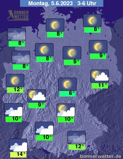 In der Nacht zum Montag ziehen im Süden teils aufgelockerte, teils dichte Wolken durch, dazu bleibt es weitgehend trocken. Etwa nördlich des Mains ist der Himmel dagegen verbreitet sternenklar, dazu bleibt es natürlich trocken. Die Temperatur sinkt auf 14 Grad in Freiburg und etwa 6 Grad in Erfurt.