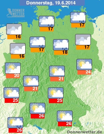 Heute ziehen im Norden häufig dichte Wolken mit etwas Regen durch. Weiter nach Süden ist es dagegen überwiegend freundlich bei zeitweiligem Sonnenschein und es bleibt trocken. Mögliche Schauer und Gewitter sind am ehesten am Schwarzwald möglich. Die Temperatur erreicht frische 16 Grad an der niederländischen Grenze und bis 26 Grad in München