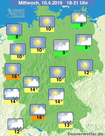 Am Abend präsentiert sich der Himmel im Norden und in der Mitte überwiegend freundlich und man kann häufig den Untergang der Sonne genießen. Im Süden und Südwesten dominieren abgesehen einiger Auflockerungen meistens noch die Wolken und gebietsweise fällt noch Regen oder es kommt zu Schauern.