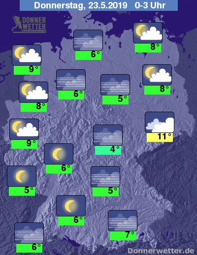 In der Nacht ist der Himmel häufig locker bewölkt oder es bildet sich Nebel, im Südwesten sowie an der Ostseeküste funkeln zeitweise auch die Sterne von einem wolkenlosen Himmel. Dichtere Wolken halten sich meist nur im äußersten Südosten des Landes, es bleibt aber trocken.