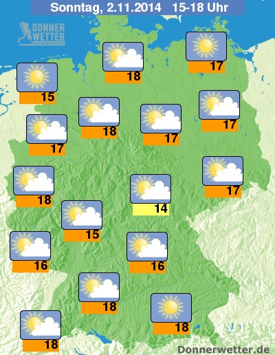 Mit ruhigem, zumeist freundlichem Hochdruckwetter verabschiedet sich das erste Novemberwochenende. Am Sonntagnachmittag und -abend werden dabei noch Temperaturen um 14 Grad C im Thüringer Wald und um 18 Grad im Schwarzwald erreicht.