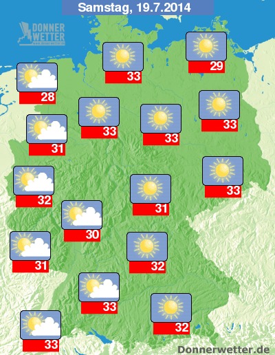Heute können wir uns erneut auf einen richtig schönen Sommertag mit reichlich Sonnenschein freuen. Während es in der Osthälfte den ganzen Tag über bei einem mehr oder weniger komplett blauen Himmel bleibt, ziehen im Westen und Süden teils schon einige Quellwolken auf, dazu bleibt es aber weitgehend trocken. Die Temperatur steigt auf 28 Grad an der Nordseeküste und rund 33 Grad in der Lausitz.