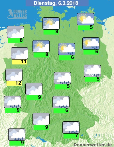 Der Himmel ist in großen Teilen Deutschlands bewölkt. Aus hohen und mittelhohen Wolkenfeldern kann jedoch gebietsweise die Sonne noch milchig hindurch scheinen. Im Südosten und Osten unseres Landes nimmt die Wolkendecke jedoch immer mehr zu und es setzen Niederschläge ein, die teils als Regen, teils auch als Schnee fallen können. Vor allem im Bayrischen Wald, dem Erzgebirge, sowie im östlichen Brandenburg muss abends und nachts mit Glätte gerechnet werden. In den anderen Teilen von Deutschland bleibt es überwiegend niederschlagsfrei. Die Höchsttemperaturen liegen allgemein zwischen 2 und 9 Grad, im Westen können milde 10 bis 14 Grad erreicht werden. Der Wind weht meist nur schwach. In der Nacht auf Mittwoch fällt vor allem im Nordosten noch zeitweise Schneefall oder Schneeregen mit Glättegefahr.