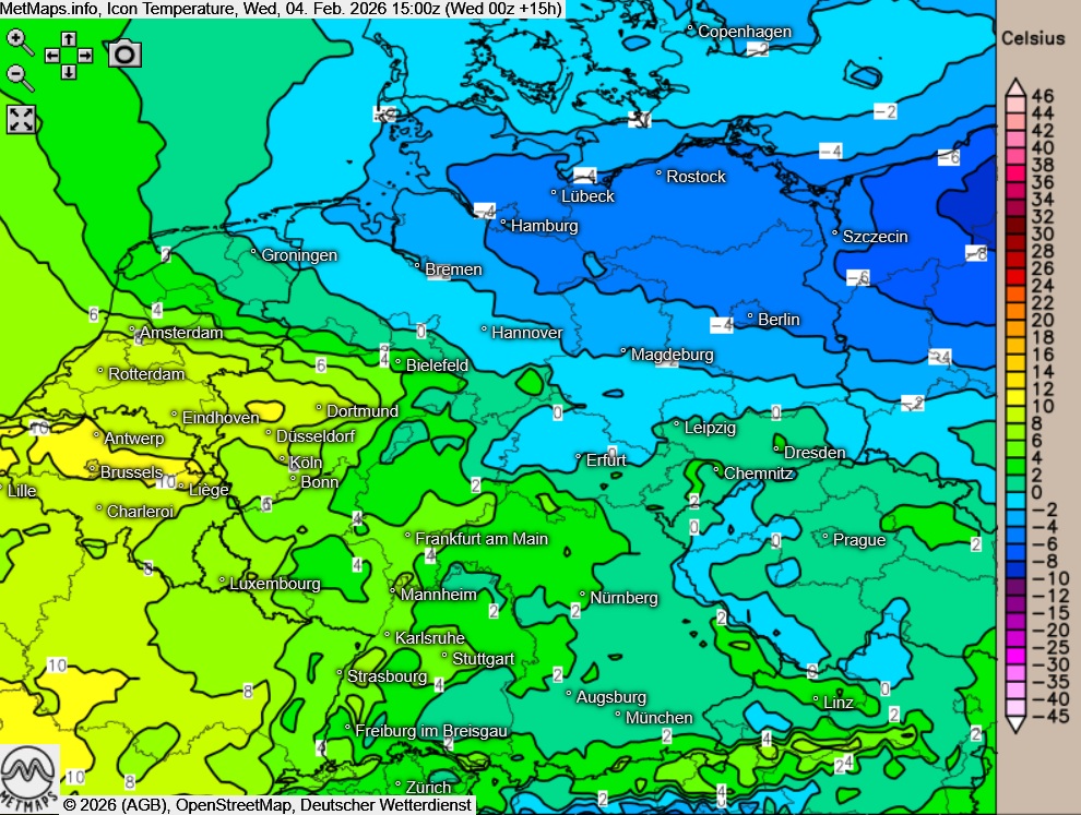 Die Temperaturen erreichen im Nordosten Höchstwerte um -5 Grad, die mildesten Werte werden mit etwa 11 Grad im Rheinland erreicht.