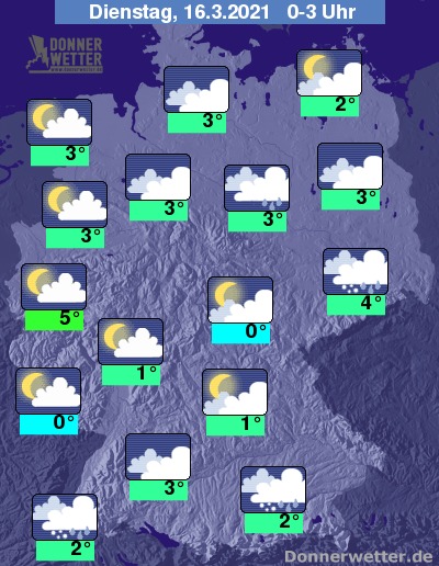 In der Nacht auf Dienstag bleibt der Himmel verbreitet bedeckt oder es ist aufgelockert bewölkt, vor allem zwischen Ostfriesland und dem Pfälzer Wald dominieren anfangs auch noch lockere Wolken. In den Mittelgebirgen sowie am Alpenrand muss in der Nacht noch mit einzelnen Schneeschauern gerechnet werden, in den Staulagen des Erzgebirges und des Schwarzwalds können einige Zentimeter Neuschnee fallen. Die Schneefallgrenze sinkt hier in der Nacht bis in tiefe Lagen. In den übrigen Landesteilen bleibt es meist trocken.