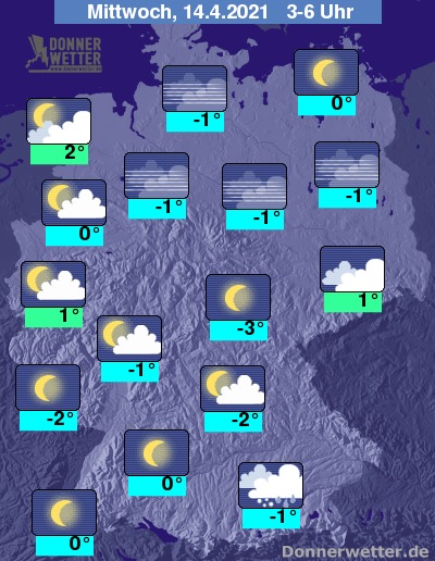 In der kommenden Nacht klingen letzte Niederschläge im Südosten ab, sonst ist es schon verbreitet sternenklar oder nur locker bewölkt. An der Nordsee ist es oft auch stark bewölkt, dazu bleibt es aber weitgehend trocken. Die Temperatur sinkt auf 2 Grad in Wilhelmshaven und bis -3 Grad in Jena.