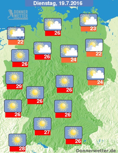 Heute zeigen sich im Norden und Osten oft heitere Abschnitte, jedoch ziehen hier auch gebietsweise einige und teils auch dichte Wolken durch, die jedoch nur örtliche Schauer und Gewitter bringen können. Im übrigen Deutschland ist es dagegen verbreitet sonnig und dazu trocken. Die Temperatur steigt auf 22 Grad im nördlichen Emsland und bis 29 Grad in der Kölner Bucht.