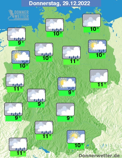 Am Donnerstag ziehen größtenteils viele und meist auch dichte Wolken durch, Auflockerungen sind möglich. Es bilden sich einzelne, teils kräftige Schauer. Die Temperatur erreicht sehr einheitliche 9 bis 11 Grad. Der Wind weht verbreitet stark und teilweise auch stürmisch, an der See herrscht zum Teil Sturm.