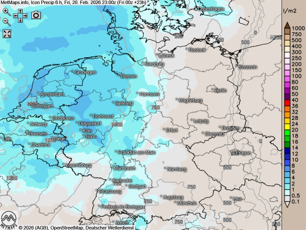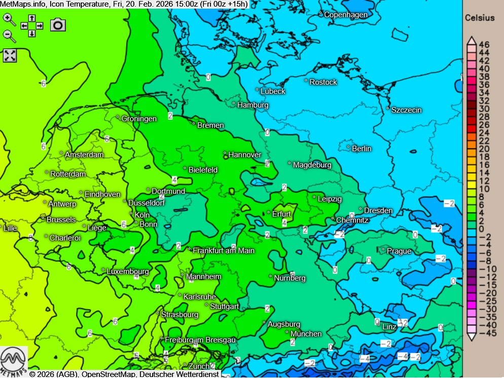 Die Temperaturen erreichen im Nordosten Höchstwerte um 0 Grad, die höchsten Temperaturen werden mit 7 Grad entlang des Rheins erreicht.