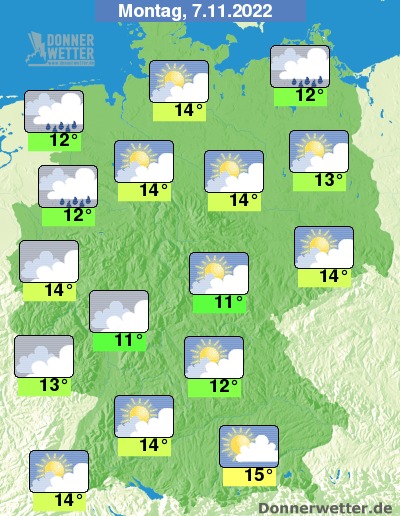 Am Montag ist es im Süden oft heiter, im übrigen Bundesgebiet hingegen überwiegend stark bewölkt oder trüb. Auflockerungen sind jedoch möglich. Im Norden fällt zudem gebietsweise Regen, während es sonst weitgehend trocken bleibt. Die Temperatur erreicht 11 Grad in Erfurt und bis 15 Grad in München. An der See ist es zum Teil stürmisch.