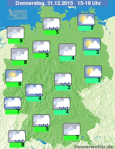 Am Silvesterabend halten sich über der Republik verbreitet dichte Wolken, dazu ist es im äußeren Osten und Nordosten anfangs noch trocken, sonst fällt vor allem östlich einer Linie vom Schwarzwald bis nach Schleswig-Holstein zeitweise Regen, zum Teil sind auch Schneeregen oder Schnee möglich, dabei besteht Glättegefahr! Weiter nach Westen hin bleibt es weitgehend trocken und vor allem im Westen lockert es auch häufig etwas auf.