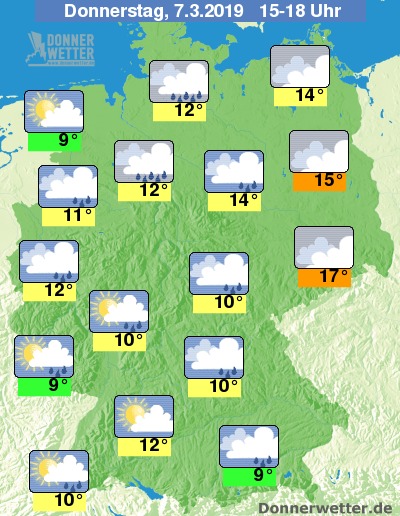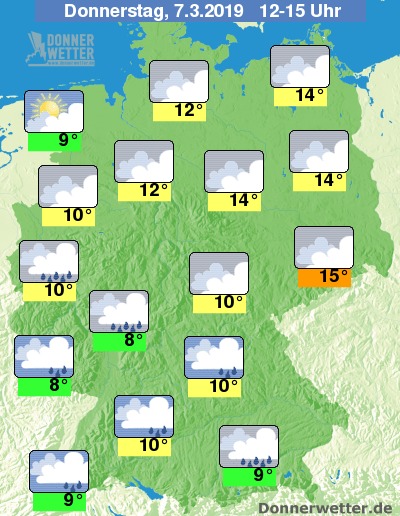 Am Nachmittag halten sich meist viele Wolken und vor allem in der Südwesthälfte fällt häufig Regen oder es treten Schauer auf. Im Norden und Nordosten bleibt es zunächst überwiegend trocken, aber auch hier bleibt der Himmel in der Regel von dichteren Wolken überzogen.