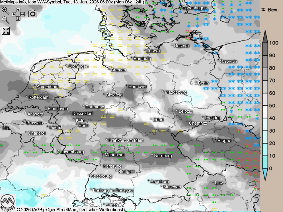 Am Dienstag zeigt sich der Himmel über weiten Landesteilen stark bewölkt oder es ist bedeckt, dabei fällt zeit- und gebietsweise Regen, im Osten und Nordosten anfangs auch gefrierend mit lokaler Gätte- / Unwettergefahr!