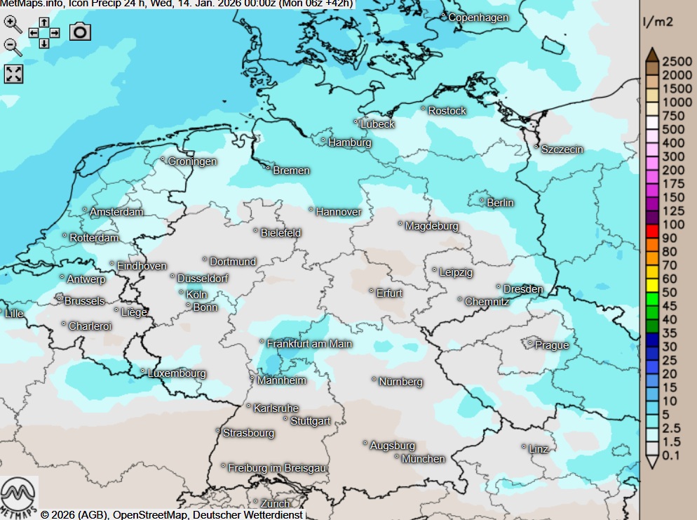 Die Wetter- und Temperaturkarte für Dienstagfrüh und die 24-Stunden-Regenmengen am Dienstag nach ICON: