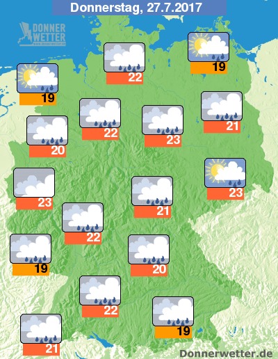 Dichte Wolken mit Regen ziehen über Deutschland hinweg. Am Nachmittag gibt es einige Auflockerungen mit etwas Sonne, aber auch noch örtliche Schauer, im Norden kann es vereinzelt auch mal blitzen und donnern. Im Harz sind dabei nochmals Niederschlagssummen zwischen 5 und 10 Liter pro Quadratmeter zu erwarten. Überwiegend trocken bleibt es am Nachmittag dann wohl nur im Nordwesten. Die Höchsttemperaturen bewegen sich in der Regel zwischen 17 und 24 Grad. Der Südwest- bis Westwind kann gelegentlich auffrischen.