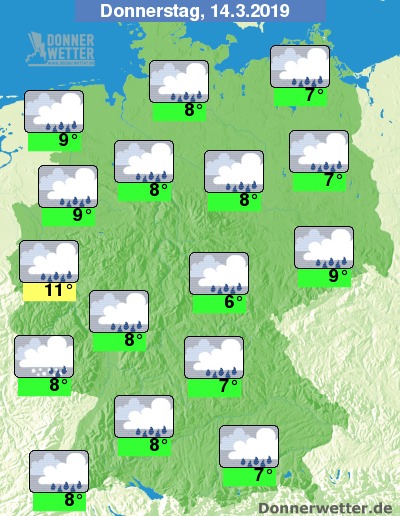 Die Höchsttemperaturen liegen zwischen 6 Grad in Thüringen und 11 Grad in den Ballungsgebieten des Westens.