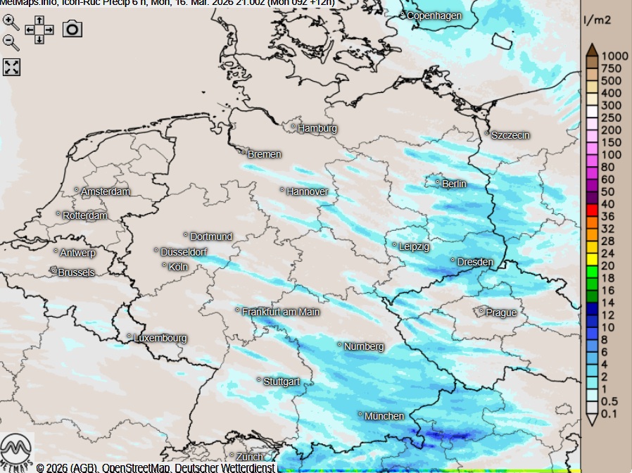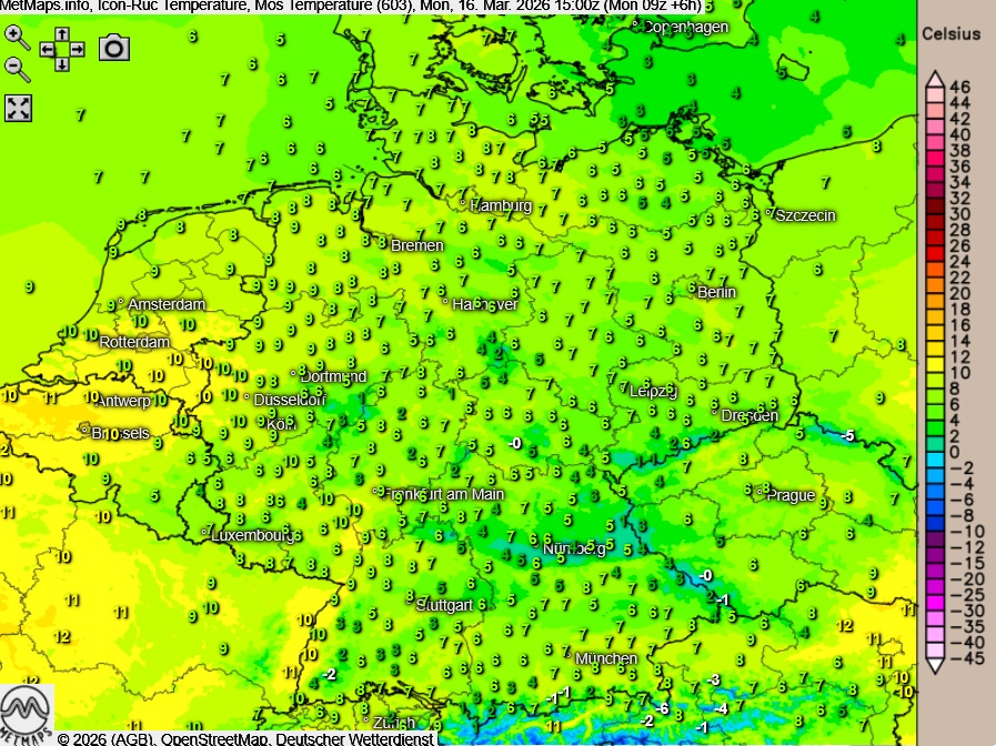 Die Wetter- und Temperaturkarte für 15:00 Uhr sowie die 6-Stunden-Regenmengen bis 21:00 Uhr nach ICON-RUC:
