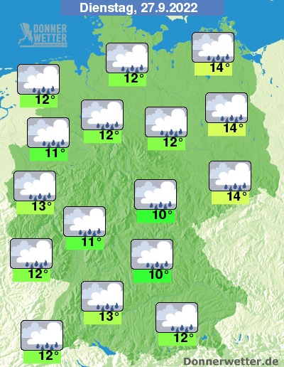 Am Dienstag ziehen überwiegend dichte Wolken durch, kurze Auflockerungen sind mal hier und da möglich. Es bilden sich wiederholt Schauer bei 10 Grad in Nürnberg und bis 14 Grad in Berlin.