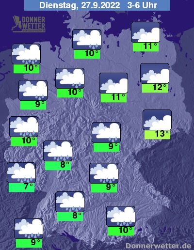 In der kommenden Nacht bleibt es verbreitet bedeckt und es fällt immer wieder, teils auch kräftiger Regen. Die Temperatur sinkt auf 13 Grad in Dresden und bis 7 Grad in Saarbrücken.