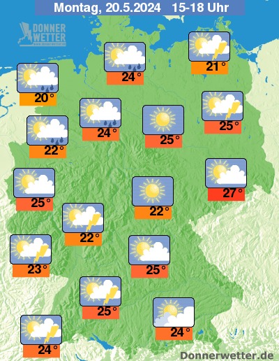 Am Nachmittag zeigt sich der Himmel verbreitet heiter bis wolkig, dabei muss vor allem im äußersten Norden und Nordosten sowie im Süden zeitweise mit Schauern und Gewittern gerechnet werden. In der nördlichen Mitte, im Westen und im Südosten sind auch längere sonnige Abschnitte möglich.
