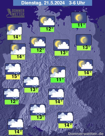 In der Nacht auf Dienstag zeigt sich der Himmel über der Nord- und Osthälfte locker bewölkt oder es ist klar, dabei bleibt es niederschlagsfrei. Im Süden und Südwesten muss bei meist starker Bewölkung zeitweise mit gewittrigen Regenfällen gerechnet werden.