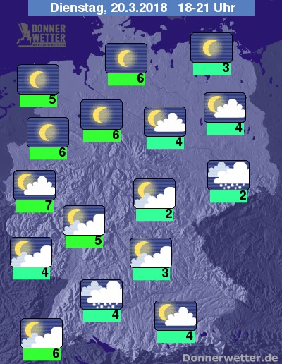 Heute Abend ist der Himmel über dem Norden und Westen meist sternenklar, im Süden und Osten ziehen dagegen oft dichte Wolken durch und es fällt hier und da auch noch etwas Schnee. Die Temperatur liegt zwischen 2 und 7 Grad.