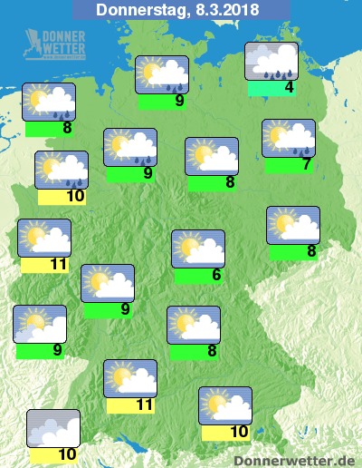 Am Donnerstag halten sich im Norden anfangs dichte Wolken und es fällt hier und da noch Regen, sonst ist es über der Nordhälfte bereits verbreitet heiter und trocken. Im Süden ist es heiter bis aufgelockert bewölkt und zunächst trocken, gegen Abend ist im Südwesten erster Regen möglich. Die Temperatur steigt auf 4 bis 11 Grad.