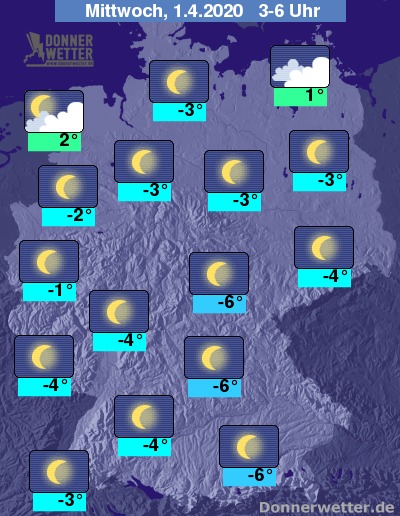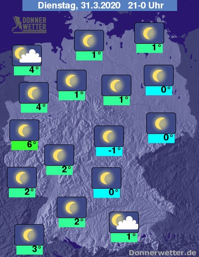 Während der zweiten Nachthälfte trübt sich der Himmel an den Küsten, sowie in Schleswig-Holstein ein und speziell in Teilen von Schleswig-Holstein kann es etwas tröpfeln oder nieseln, im übrigen Land leuchten verbreitet Halbmond und Sterne.