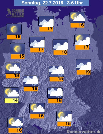 In der Nacht zum Sonntag ist es über dem Norden und Osten teils stark, teils auch nur locker bewölkt oder klar, dazu jedoch verbreitet trocken. Im Süden, Westen und der Mitte des Landes ziehen jedoch oft dichte Wolken durch, die vor allem in der ersten Nachthälfte gebietsweise Schauer und mögliche Gewitter bringen. Gegen Morgen sind kaum noch Schauer möglich. Die Temperatur sinkt auf 19 Grad in Bonn und bis 14 Grad am Pfälzer Wald.