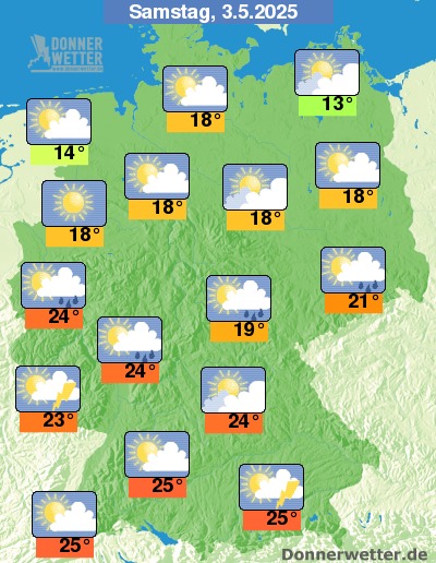 Am Samstag sind im Norden bei wechselnder Bewölkung zunächst noch einzelne Schauer möglich, im Tagesverlauf setzt sich hier dann auch häufiger die Sonne durch. Im Süden beginnt der Samstag anfangs sonnig, im Tagesverlauf steigt dann das Schauer- und Gewitterrisiko an.