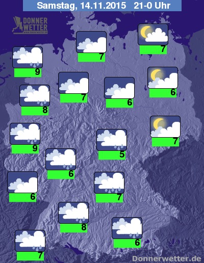 In den späteren Abendstunden bestimmen überwiegend dichte Wolken das Himmelsbild. Lockere Wolkenfelder ziehen vior allem durch die Süd- und Osthälfte des Landes. Einzelne Schauer sind vor allem am Mittelrhein sowie an der Nordseeküste möglich. Die Temperaturen liegen bei Werten um 7 bis 11 Grad C.