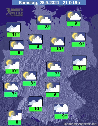 In der Nacht zum Sonntag bleibt der Himmel über den Alpen und an der Nordseeküste noch stark bewölkt und es sind einzelne Schauer möglich. Dazwischen klart es verbreitet auf oder es ist nur gering bewölkt, dabei bleibt es meist niederschlagsfrei. Gebietsweise kann sich Nebel bilden.