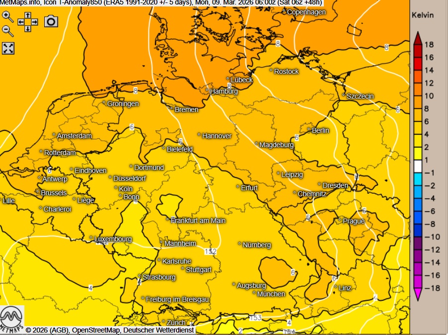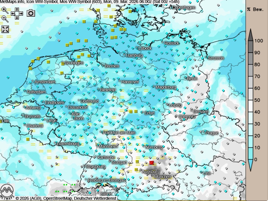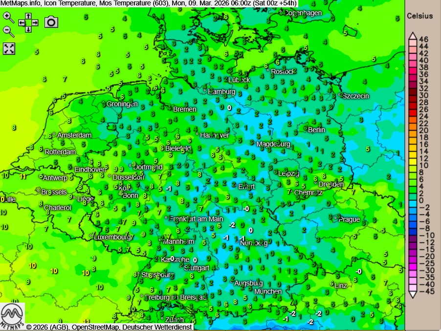 Die Temperatur- und Wetterkarte sowie die Temperaturabweichung für 06:00 Uhr nach ICON: