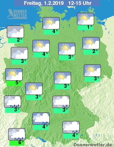 In den Nachmittags- und frühen Abendstunden zeigt sich der Himmel über weiten Landesteilen stark bewölkt oder bedeckt, vor allem in der Nord- und Osthälfte ist der Himmel meist aufgelockert bewölkt. Südlich des Mains sowie an der Nordseeküste muss zeitweise mit Regen, Schneeregen oder Schnee gerechnet werden, sonst bleibt es meist trocken.