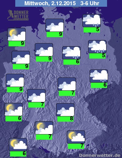 Am Mittwoch fällt im Nordosten und im äußeren Osten des Landes anfangs noch zeitweise Regen, auch sonst bleibt es oft stark bewölkt aber trocken, hier und da kann sich aber auch die Sonne mal blicken lassen. Vor allem am Nachmittag ist es im Süden und Südwesten auch gebietsweise heiter bis sonnig, sonst bleibt es bei meist starker und teils aufgelockerter Bewölkung ebenfalls trocken. Die Temperatur steigt auf 8 Grad in Oberfranken und bis auf 12 Grad im Breisgau. An Nord- und Ostsee weht ein teils starker Wind.