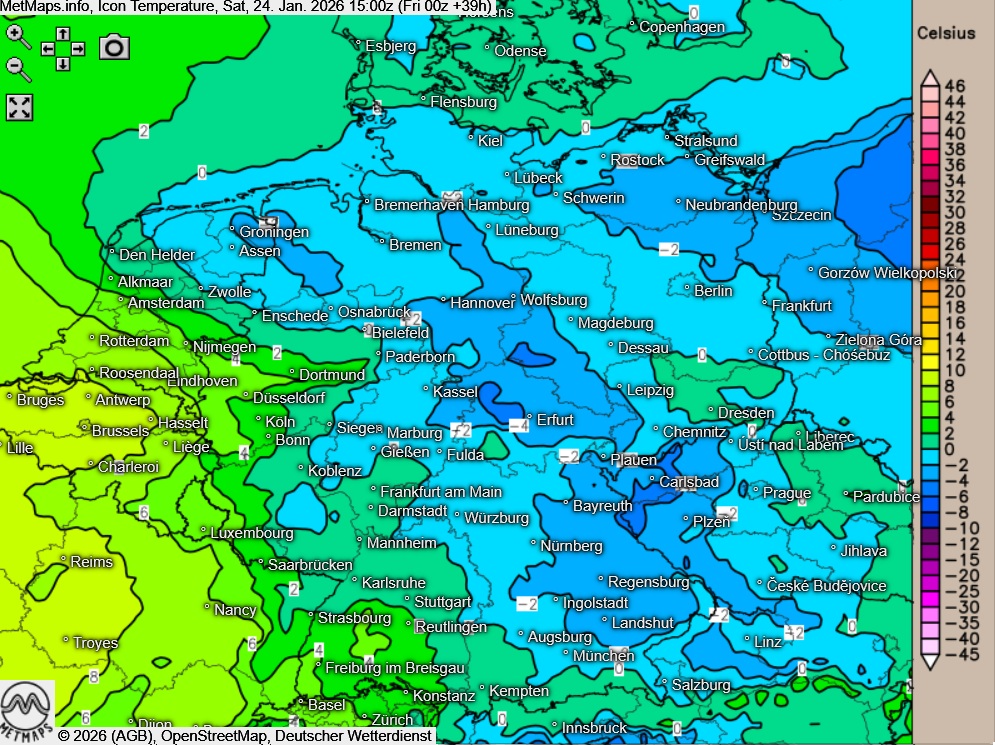 Die Temperaturen erreichen Höchstwerte meist zwischen -3 und 2 Grad, im Südwesten sind bis zu 7 Grad möglich.