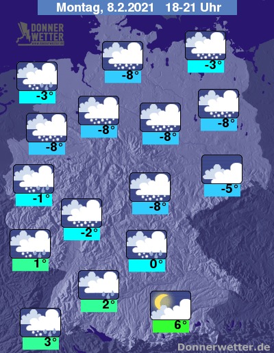 Heute Abend fällt über dem Bundesgebiet verbreitet Schnee und die Wolkendecke bleibt fast überall verschlossen. Im Süden hält sich noch mildere Luft, so dass die Niederschläge hier zum Teil auch als Schneeregen oder Regen fallen. Lediglich im Südosten des Landes ist es auch oft nur locker bewölkt, hier bleibt es weitgehend trocken. Die Temperatur liegt bei -8 Grad im Thüringer Becken und bis zu 6 Grad in München.