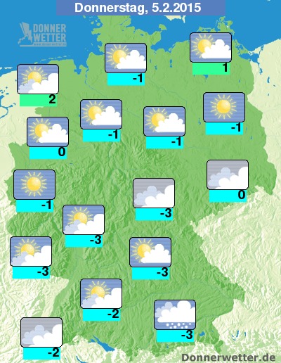 Heute bleiben vor allem im Stau der Alpen die Wolken überwiegend dicht und es schneit zeitweise, aber auch in der Mitte und im Osten des Landes halten sich oft dichte Wolken, hierbei fällt allerdings nur gelegentlich etwas Schnee. In den anderen Landesteilen ist es zumeist locker bis aufgelockert bewölkt und dabei trocken. In weiten Teilen Berlin-Brandenburgs und Westdeutschlands ist es zeitweise sogar sonnig. Die Temperatur steigt auf -3 Grad in München und bis 2 Grad an der Nordseeküste.