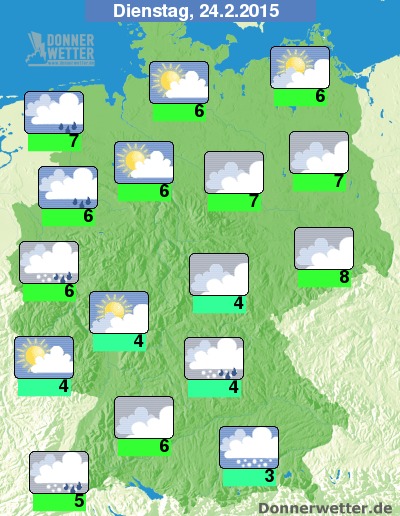 Heute fällt unter dichten Wolken zunächst vor allem im Süden, am Nachmittag mit Schwerpunkt im Westen der Republik zeitweise Regen, gebietsweise ist auch Schneeregen oder Schnee möglich. In den anderen Regionen ist es überwiegend stark, vor allem nach Norden hin aber auch teils locker bewölkt, dabei bleibt es überwiegend trocken. Die Temperatur steigt auf 3 Grad in München und bis 8 Grad in Dresden.