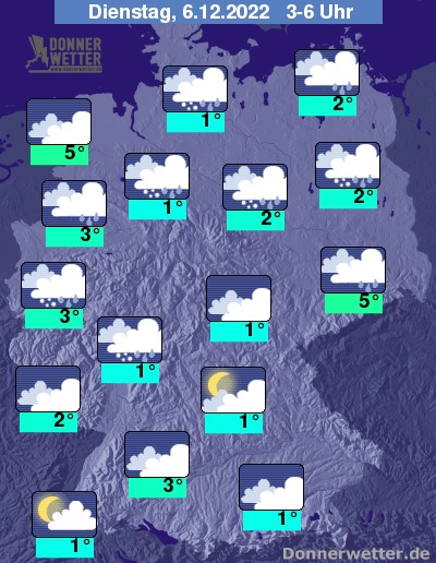In der Nacht auf Dienstag fällt vor allem von NRW bis zur Ostsee immer wieder Regen, Schneeregen oder Schnee, im Südosten des Landes regnet es zeitweise auch kräftiger. Sonst bleibt es unter einer meist geschlossenen Wolkendecke überwiegend trocken, einzelne Auflockerungen und Nebelbildung gibt es lokal im Süden und Südwesten.