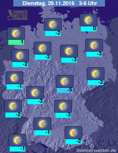 In der Nacht zum Dienstag ist der Himmel über Deutschland verbreitet sternenklar, dabei bleibt es auch trocken. Die Temperatur sinkt auf 1 Grad im nördlichen Emsland und bis -5 Grad im Eichsfeld.