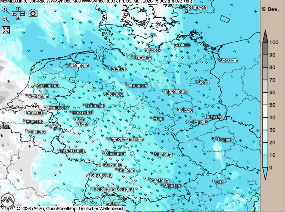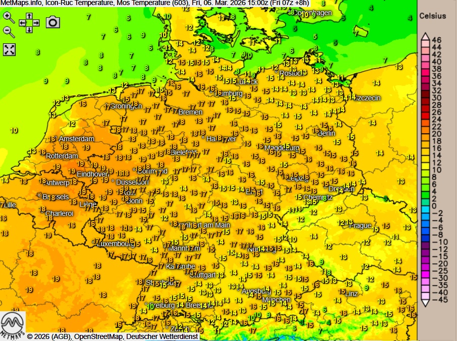 Die Wetter- und Temperaturkarte für Freitagnachmittag (15:00 Uhr) nach ICON-RUC: