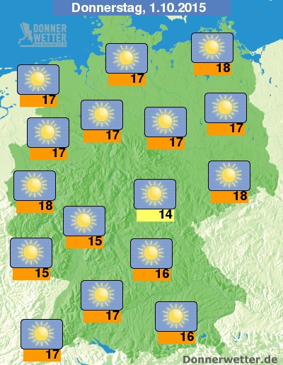 Am Donnerstag scheint über der Bundesrepublik landesweit die Sonne, dabei ziehen nur hier und da mal harmlose Wolken durch. Es bleibt überall trocken, dabei steigen die Temperaturen auf 14 Grad am Frankenwald und bis 18 Grad in Vorpommern.